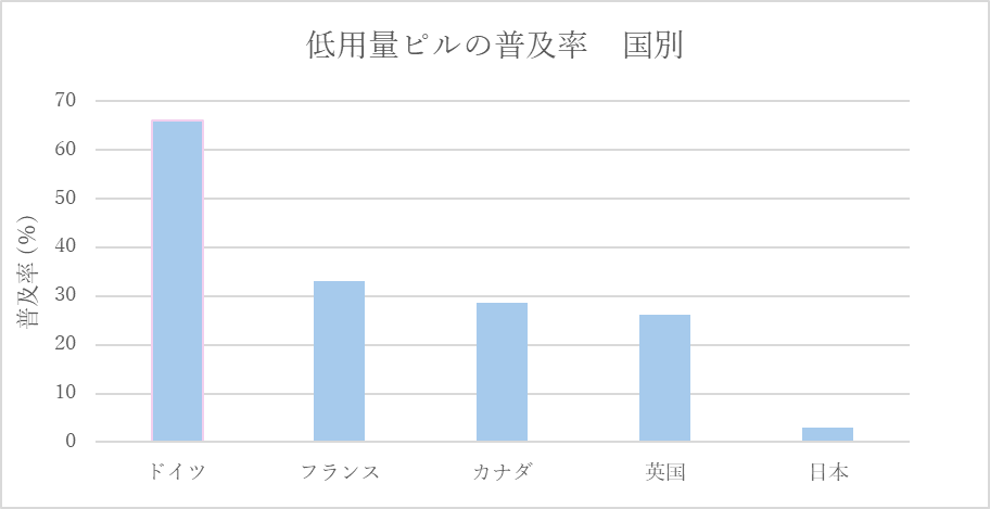 世界保健機関(WHO)によると2021年時点で、8億7400万人の女性が低用量ピルを使用しています。調査によると、最も普及率が高いドイツでは66%であるのに対し、日本ではわずか2.9%にとどまっています。
