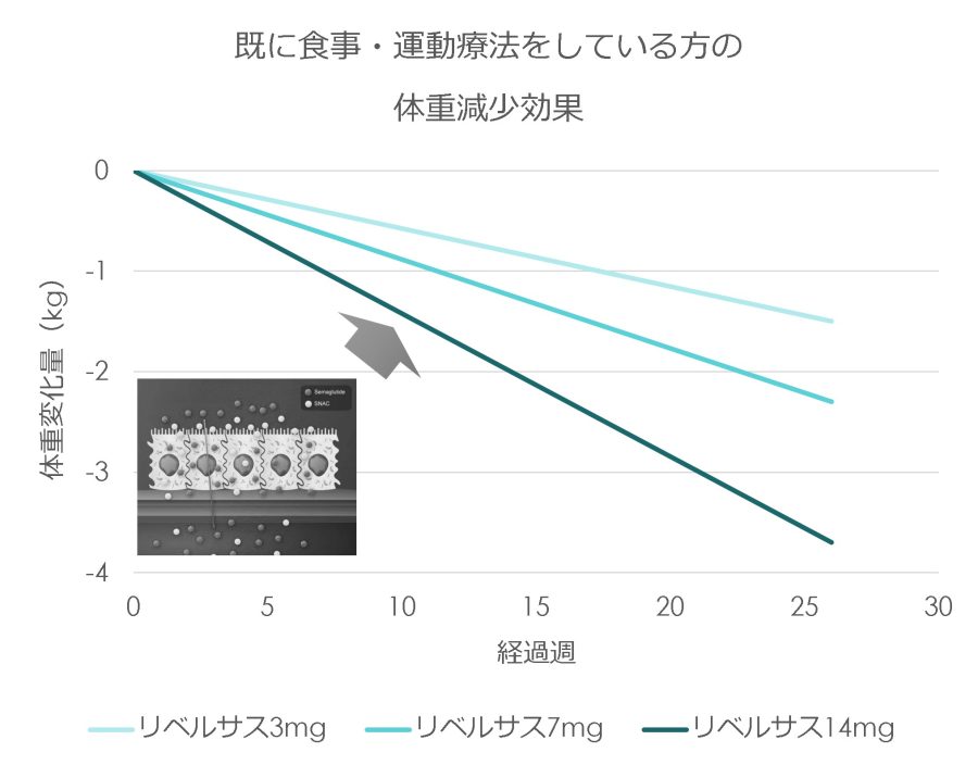 たとえば、当院で扱っているGLP-1受容体作動薬 リベルサスの有効性と安全性を評価した試験では、医学的に有意な体重減少効果が認められています。(M.F.Rasmussen, Diabetol Int, 2020)